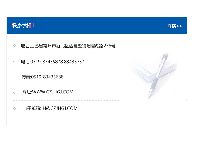 地址:常州市新北區友邦商務大廈1幢16、17層  電話:0519-85101652  傳真:0519-85112595  郵編:213022  網址:www.cz-jiayue_cn.njsfzz.com  郵箱:xiajifengaa@163.com
